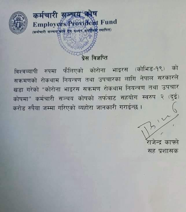 काठमाडौं । कर्मचारी सञ्चय कोषले कोरोना भाइरसको संक्रमणको रोकथाम कोषमा दुई करोड रुपैयाँ सहयोग गरेको छ । विश्वव्यापी रुपमा फैलिएको कोरोना भाइरसको संक्रमणको रोकथाम नियन्त्रण तथा उपचारका लागि नेपाल सरकारले खडा गरेको कोरोना भाइरस रोकथाम नियन्त्रण तथा उपचार कोषमा उक्त रकम जम्मा गरेको जनाइएको हो ।