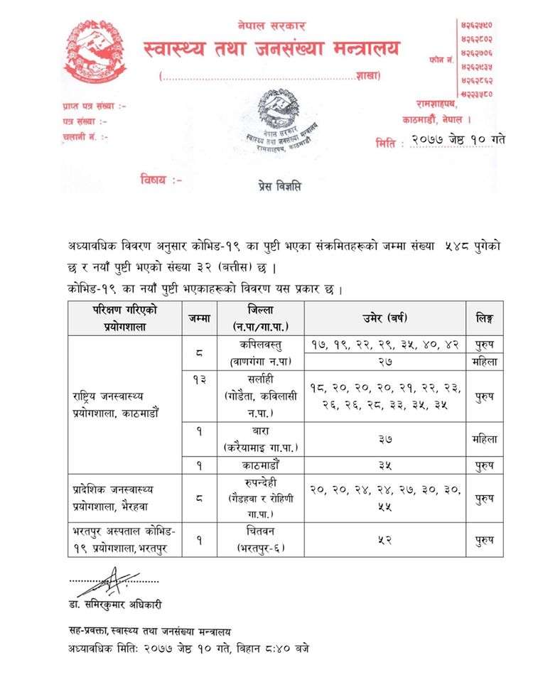 स्वास्थ्य तथा जनसंख्या मन्त्रालयले कपिलवस्तु, सर्लाही, रुपन्देही, काठमाडौंलगायतका जिल्लामा कोरोना संक्रमित भेटिएको जनाएकोछ । नयाँ तथ्याङ्कसँगै कोरोना संक्रमितको संख्या ५ सय ४८ पुगेको स्वास्थ्य तथा जनसंख्या मन्त्रालयले जनाएको छ । राजधानी काठमाडौंको गोकर्णेश्वरमा कोरोना संक्रमित भेटिएको जनाइएको छ । त्यस्तै, सर्लाहीको गोडैता र कविलासी नगरपालिकामा १३ जना संक्रमित भेटिएका छन् । त्यस्तै कपिलवस्तुको वाणगंगा नगरपालिकामा ८ जना संक्रमित भेटिएका छन् ।