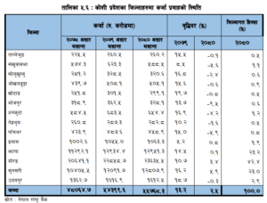 यसैगरी २०७९ असार मसान्तको तुलनामा २०८० असार मसान्तमा यस प्रदेशमा बैंक तथा वित्तीय संस्थाले प्रवाह गरेको कर्जा २.५ प्रतिशतले वृद्धि भई रु.५ खर्ब ५७ अर्ब पुगेको छ । २०८० असार मसान्तसम्म प्रवाहित कुल कर्जामध्ये कृषि कर्जाको हिस्सा १०.९७ प्रतिशत, औद्योगिक कर्जाको हिस्सा २३.१६ प्रतिशत र सेवा क्षेत्रमा प्रवाहित कर्जाको हिस्सा ६५.८६ प्रतिशत रहेको छ। २०७९ असार मसान्तमा कृषि कर्जाको हिस्सा १० प्रतिशत, औद्योगिक क्षेत्रको हिस्सा २२.३ प्रतिशत र सेवा क्षेत्रमा प्रवाहित कर्जाको हिस्सा ६७.७ प्रतिशत रहेको थियो। कोशी प्रदेशमा अवस्थित बैंक तथा वित्तीय संस्थाले प्रवाह गरेको कुल कर्जामध्ये झापा, मोरङ र सुनसरीमा प्रवाहित कर्जाको हिस्सा ८८.६ प्रतिशत रहेको छ भने अन्य जिल्लाको ११.४ प्रतिशत रहेको छ। जिल्लागत कर्जा प्रवाहको आधारमा मोरङ जिल्लाको हिस्सा सबैभन्दा बढी ४२.४ प्रतिशत र ताप्लेजुङ, खोटाङ तथा तेह्रथुम जिल्लाको हिस्सा सबैभन्दा कम क्रमशः ०.५ प्रतिशत रहेको छ।