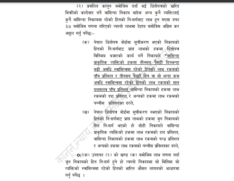 आयकर ऐन २०५८ को दफा ९५ (क) को उपदफा २ (क) मा नेपाल धितोपत्र बोर्डमा सूचिकरण भएको निकायको हितको निःसर्गबाट प्राप्त लाभको हकमा धितोपत्र विनिमय बजारको कार्य गर्ने निकायले बासिन्द प्राकृतिक व्यक्तिको हकमा ३६५ दिनभन्दा ब९ अवधि स्वामित्वमा रहेको हितको लाभ रकमको ५ प्रतिशत र ३६५ दिन वा सो भन्दा कम अवधि स्वामित्व रहेको हितको लाभ रकमको ७.५ प्रतिशत बासिन्दा निकायको हकमा लाभ रकमको १० प्रतिशत र अन्यको हकमा लाभ रकमको २५ प्रतिशतका दरले अग्रिम कर असुल गर्नु पर्ने व्यवस्था गरेको छ ।