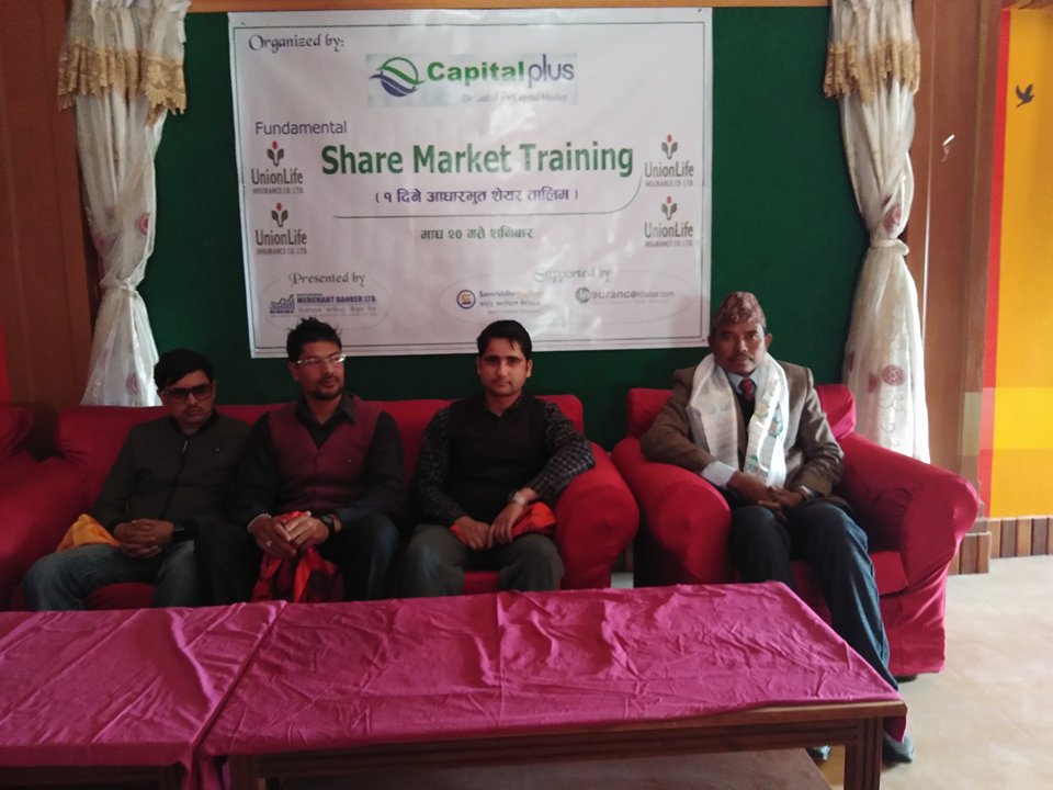शेयर कारोबारका लागि आवश्यक आधारभुत ज्ञान प्रदान गर्ने उदेश्यले तालिम आयोजना गरिएको आयोजक संस्था क्यापिटल प्लस का संचालकहरु ले बताएका छ्न। क्यापिटल प्लस बिशेष गरी राजधानी बाहिरका लगानीकर्ताको हक, हित र लगानीकर्ता शिक्षामा समर्पित रहेको संस्था हो ! सो एक दिने आधारभुत सेयर तालिममा एक सय ५० जनाको सहभागिता रहेको थियो। निकट भबिष्यमा बाँके को नेपालगंज, तनहु को दमौली र पोखरामा एकदिने आधारभुत सेयर तालिम संचालन हुन गइरहेको सो संस्थाका संचालक सन्तोस बहादुर छेत्रीले जानकारी दिनु भयो !