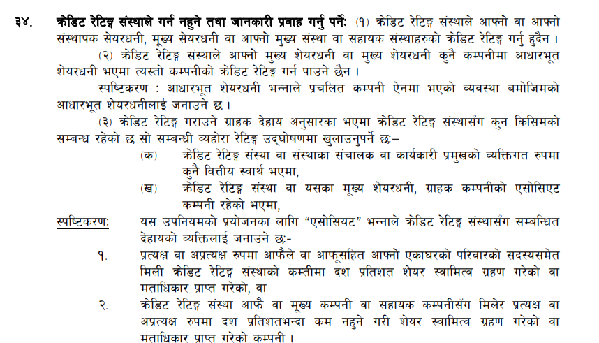 धिताेपत्र नियमावलीमा “क्रेडिट रेटिङ्ग” भन्नाले निष्काशनकर्ताको धितोपत्र, कुनै व्यक्ति वा संगठित संस्थाको साखको गुणस्तर सम्बन्धमा मूल्याङ्कन गर्ने तथा राय प्रकट गर्ने लगायत तत् सम्बन्धी प्रकृया समेत सम्झनुपर्छ भन्ने उल्लेख छ।