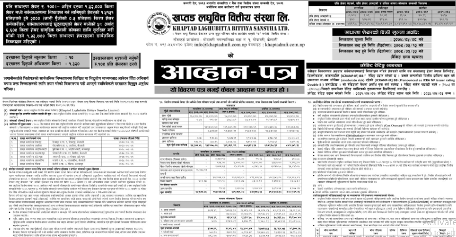 काठमाडौं । खप्तड लघुवित्त वित्तीय संस्था लिमिटेडले भदौ ८ गतेदेखि सर्वसाधारणका लागि आइपीओ निष्काशन तथा विक्री खुला गर्ने भएको छ । लघुवित्तले जारी पूँजी ४ करोडको प्रतिशेयर १ सय रुपैयाँ अंकित दरमा १ करोड ३२ लाख बराबरको १ लाख ३२ हजार कित्ता आइपीओ जारी गर्न लागेको हो ।