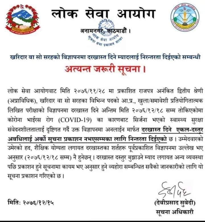 लोक सेवाबाट फागुन २८ गते प्रकाशित साजपत्र अंनकित द्धितीय श्रेणी खरिदार वा सो सरहका विभिन्न पदको आ.प्र खुला समावेशी प्रतियोगितात्मक लिखित परिक्षाको विज्ञापनमा दरखास्त दिने अन्तिम समय चैत १८ गतेसम्म तोकिएकोमा कोरोना भाइरसको महामारीको कारण दरखास्त दिने एकल दस्तुर अवधिलाई अर्को सूचना प्रकाशन नभएसम्मका लागि निरन्तरता दिएको जनाइएको छ ।