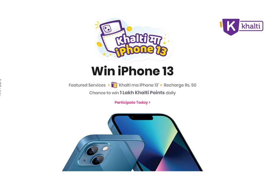 काठमाडौं । खल्तीले फेरि ल्यायो आइफोन जित्ने योजना ल्याएको छ । खल्तीले “खल्ती मा आइफोन १३” अफर र साथै १ लाख खल्ती पोइन्ट्स मात्र ५० मा नामक योजना ल्याएको हो । यस क्याम्पेन ५ डिसेम्बर देखि सुरु हुदैँ १४ जनवरी सम्म लागु हुने खल्तीले जनाएको छ।