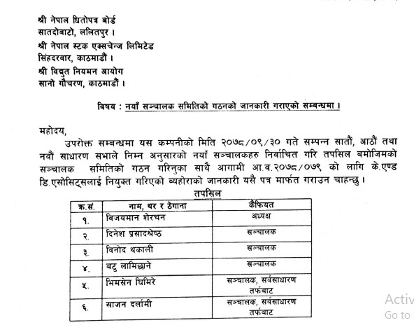 नयाँ सञ्चालकमा अध्यक्ष विजयमान शेरचन चयन भएका छन् । त्यसैगरी सञ्चालकहरुमा दिनेश प्रसाद श्रेष्ठ,विनोद थकाली,बटु लामिछाने, भिमसेन घिमिरे र साजन दर्लामी चयन भएको कम्पनीले एक सुचना जारी गर्दै जनाएको छ ।