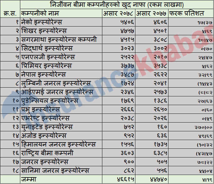 कोभिड १९ को महामारीको अवधिमा पनि निर्जीवन बीमा कम्पनीहरुले समग्रमा खुद बीमा शुल्क आर्जन १८ प्रतिशतले बढाउन सफल भएका छन् भने खुद मुनाफा ४.०२ प्रतिशतले बढाउन सफल भएका हुन् । कोभिड १९ का कारण नेपाल सरकारले निरन्तर रुपमा निषेधाज्ञा गरिरहेको छ । साथ साथै अत्यावस्यक किसिमका व्यापार व्यवसाय बाहेक अन्य व्यवसाय प्राय ठप्प छ । यसबा बाबजुत पनि निर्जीवन बीमा कम्पनीले व्यवसाय भित्र्याउन तथाल मुनाफा बढाउन सफल भएका हुन् । व्यवसायको बृद्धि भए अनुसार मुनाफामा भने खासै सुधार देखिदैन ।