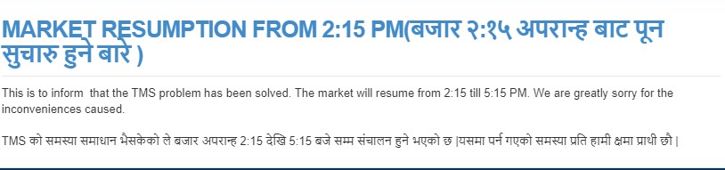 नेप्सेले उक्त समस्या समाधान भएकाले फेरि कारोबार सुरु गरिएको जनाएको छ । टिएमएसमा भएको समस्या सामाधान पश्चात् २ः १५ बाट बजार पुनः खुलेको हो । आज नेप्से साँझ ५ः१५ बजेसम्म खुल्ने नेप्सेले जनाएको छ।