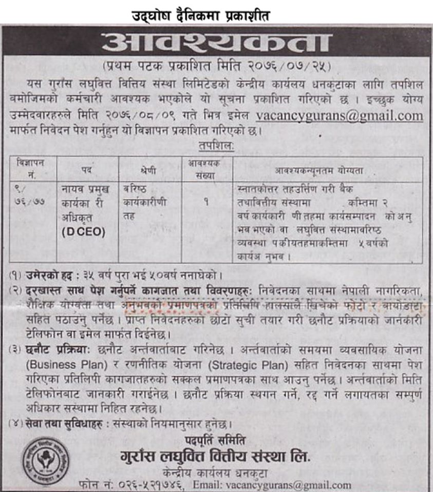 धनकुटा । गँरास लघुवित्त वित्तीय संस्थाले कर्मचारीको माग गरेको छ । संस्थाले नायव प्रमुख कार्यकारी अधिकृत पदको लागि कर्मचारीको माग गरेको जनाएको छ ।