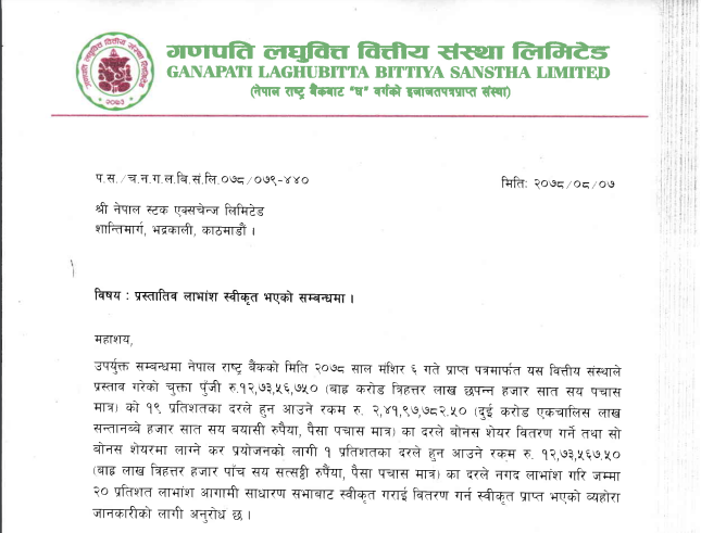 काठमाडौं । गणपति लघुवित्त वित्तीय संस्था लिमिटेडको प्रस्तावित लाभांश नेपाल राष्ट्र बैंकबाट स्वीकृत भएको छ । कम्पनीले गत आर्थिक वर्षको नाफाबाट आफ्ना शेयरधनीहरुलाई हाल कायम चुक्ता पूँजीको आधारमा १९ प्रतिशत बोनश शेयर र कर प्रयोजनका लागि समेत गरी १ प्रतिशत नगद लाभांश वितरण गर्ने गरेको थियो । उक्त प्रस्तावलाई राष्ट्र बैंकले स्वीकृत गरेको हो ।