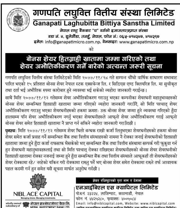 काठमाडौं । गणपति लघुवित्त वित्तीय संस्था लिमिटेडले बोनश शेयर शेयरधनीहरुको हितग्राही खातामा जम्मा गरेको छ । संस्थाले गत फागुन २८ गते सम्पन्न चौंथो वार्षिक साधारण सभाबाट पारित गरेको १५ प्रतिशत बोनश शेयर बुक क्क्लोज भएको अघिल्लो दिन अर्थात् फागुन १३ गतेसम्म कायम सेयरधनीहरुको हितग्राही खातामा जम्मा गरेको जनाएको छ ।