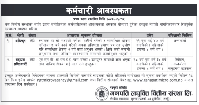 काठमाडौं । गणपति लघुवित्त वित्तीय संस्था लिमिटेडले विभिन्न पदका लागि कर्मचारीको माग गरेको छ । संस्थाले अधिकृत र सहायक प्रशिक्षार्थी पदको लागि कर्मचारी मागेको जनाएको छ ।