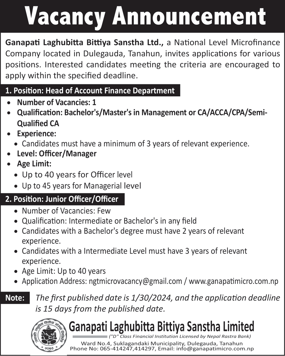 काठमाडौं । गणपति लघुवित्त वित्तीय संस्था लिमिटेडले कर्मचारी माग गरेको छ । कम्पनीले हेड अफ एकाउन्ट फाइनान्स डिपार्टमेन्टमा १ जना, जूनियर अफिसर तथा अफिसरका लागि केही संख्यामा कर्मचारी माग गरेको हो ।