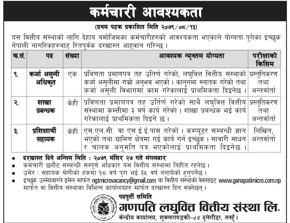गणपति लघुवित्तले माग्यो ३ पदका लागि कर्मचारी, कहिलेसम्म दिने आवेदन ?