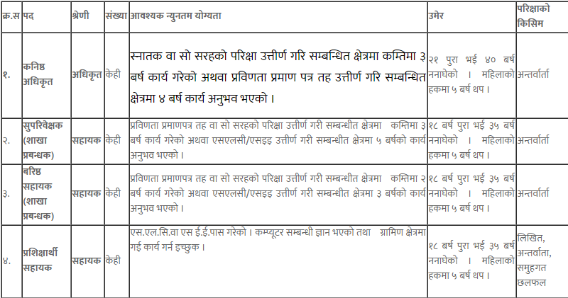 संस्थाले आफ्नो विभिन्न शाखा कार्यालयका लागि कर्मचारीको माग गरेको जनाएको छ । ईच्छुक तथा योग्यता पुगेका नेपाली नागरिकहरूले पुस २८ गते मंगलबारभित्र इमेल मार्फत आवेदन दिन सक्नेछन् ।