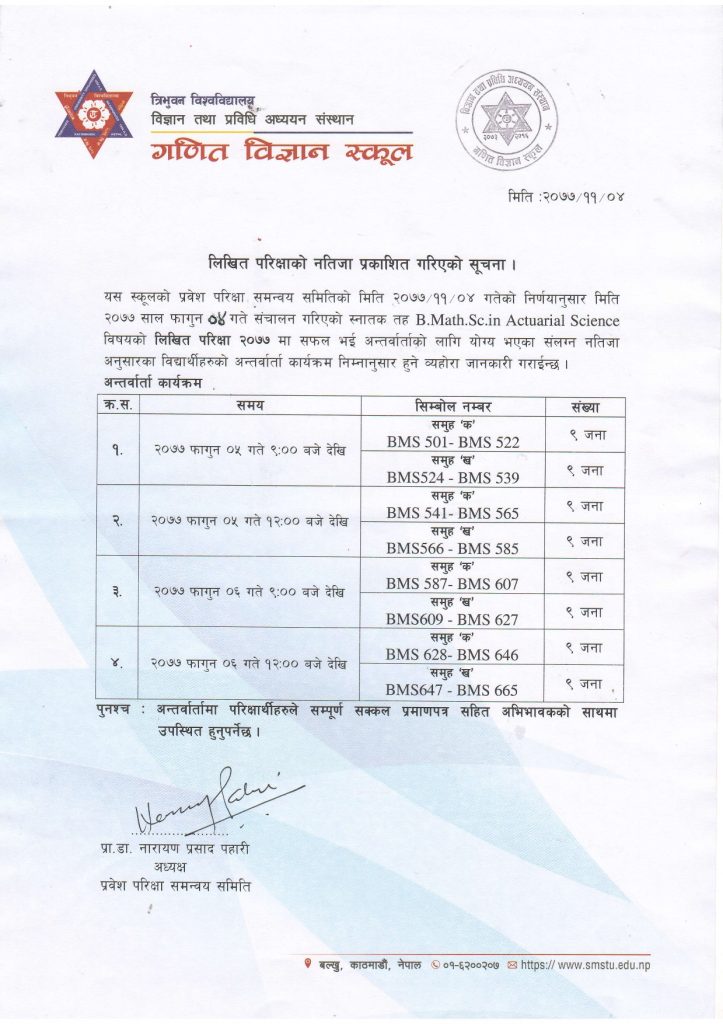 काठमाडौं । त्रिभुवन विश्वविधालय अन्र्तगतको गणित विज्ञान स्कूलले लिखित परिक्षामा सफल भई अन्र्तवार्ताको लागि योग्य विधार्थीहरुको नामावली सार्वजनिक गरेको छ । स्कूलले ७२ जनाको नामावाली सार्वजनिक गरेको हो ।