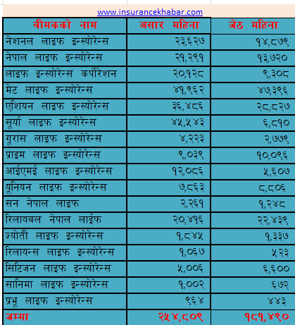 नेशनल लाईफ इन्स्योरेन्स कम्पनीले २३ हजार ६ सय २७ वटा बीमालेख जारी गरेको छ । नेपाल लाईफले २१ हजार २ सय ९१ बीमालेख जारी गरेको छ भने लाईफ इन्स्योरेन्स कर्पोरेशनले २० हजा १ सय २८ वटा बीमालेख जारी गरेका छन् ।