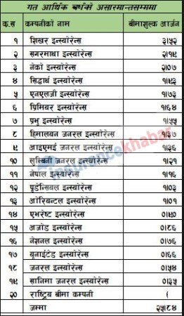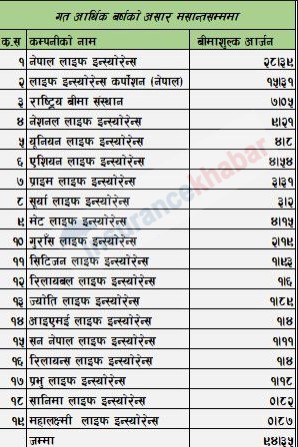 १९ जीवन बीमा कम्पनीहरुबाट ९४ अर्ब ३५ करोड र राष्ट्रिय बीमा कम्पनी बाहेकका १९ निर्जीवन बीमा कम्पनीहरुबाट २५ अर्ब ८४ करोड रुपैयाँ गरी सो बराबरको कुल बीमाशुल्क आर्जन गरेको हो । चालु आर्थिक वर्षमा जीवन बीमातर्फ नेपाल लाइफ र निर्जीवन बीमातर्फ शिखर इन्स्योरेन्स सबैलाई उछिनेर आफ्नो अग्रता कायमै रहन सफल भएका छन् । यस अवधिमा नेपाल लाइफले २८ अर्ब ३९ करोड र शिखर इन्स्योरेन्सले ३ अर्ब ५२ करोड रुपैयाँ बराबरको कुल बीमाशुल्क आर्जन गर्न सफल भएका छन् ।