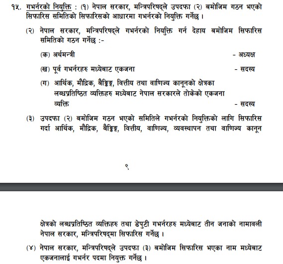 सरकारले गभर्नर नियुक्तीको लागि प्रक्रिया अघि नबढाएको कारण फागुन महिनाभित्रमा गभर्नर नियुक्तीको सम्भावना टरेको छ । नेपाल राष्ट्र बैंक ऐनमा २०५८ मा गभर्नर नियुक्तीका लागि निकै लामो प्रक्रिया तोकेको छ । अर्थमन्त्रीको प्रस्तावमा नेपाल सरकार मन्त्रिपरिषदको बैठकले अर्थमन्त्रीको अध्यक्षतामा पूर्व गभर्नर तथा स्वतन्त्र आर्थिक, बाणिज्य कानुन, वित्त व्यवस्थापक विज्ञलाई सहभागी गराएर तीन सदस्यीय गभर्नर सिफारिस समिति गठन गर्नुपर्नेछ । सो समितिले डेपुटी गभर्नर तथा आर्थिक, मौद्रिक, वित्त, व्यवस्थापन तथा बाणिज्य कानुन क्षेत्रका ज्ञाता मध्येबाट एक जनासहित तीन जनाको नाम गभर्नरमा नियुक्तीका लागि सिफारिस गर्नेछ ।