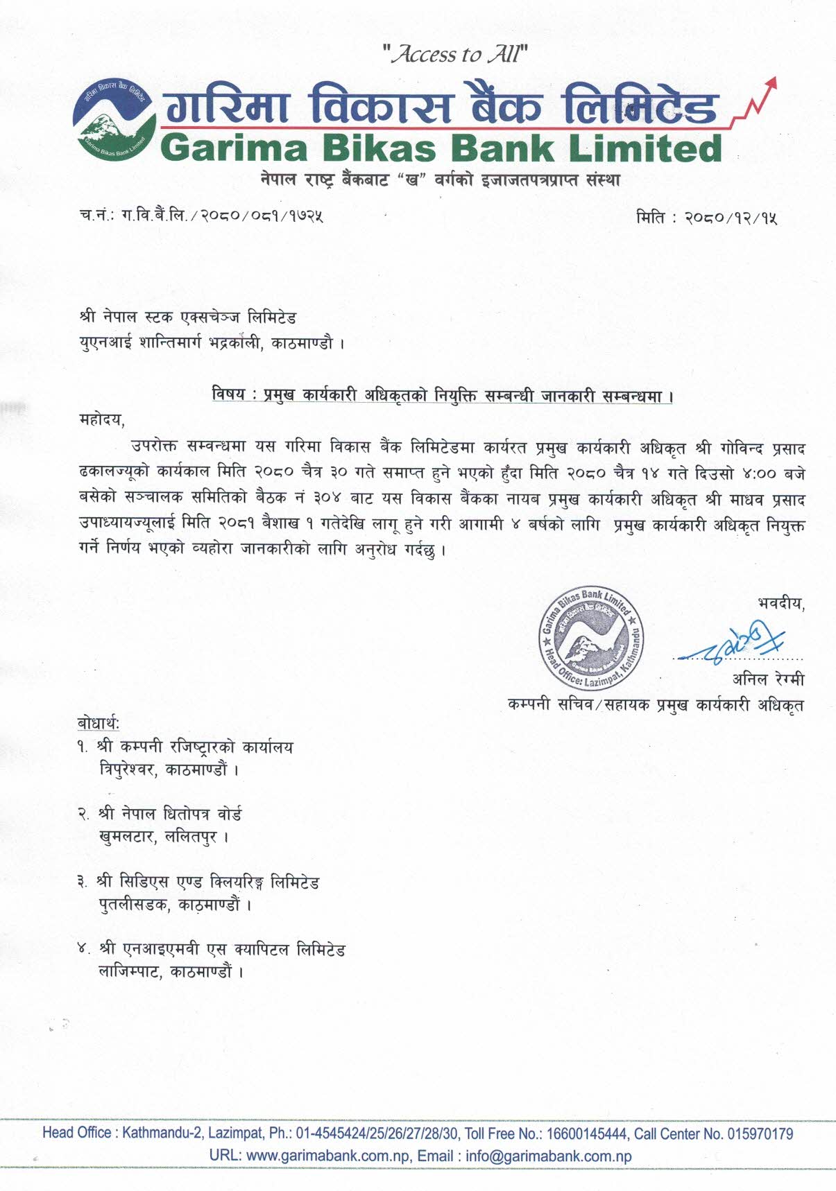 काठमाडौं । गरिमा विकास बैंकको प्रमुख कार्यकारी अधिकृतमा माधव प्रसाद उपाध्याय नियुक्त भएका छन् । कम्पनीको चैत १४ गते बसेको संचालक समितिको बैठकले उपाध्यायलाई सिइओमा नियुक्त गर्ने निर्णय गरेको हो । यस अघि बैंकका सिइओ गोविन्द प्रसाद ढकालको कार्यकाल यही चैत ३० गते सकिने हुँदा उपाध्यायलाई बैशाख १ गतेबाट लागू हुने गरी ४ वर्षको कार्यकालका लागि नियुक्त गरिएको हो ।