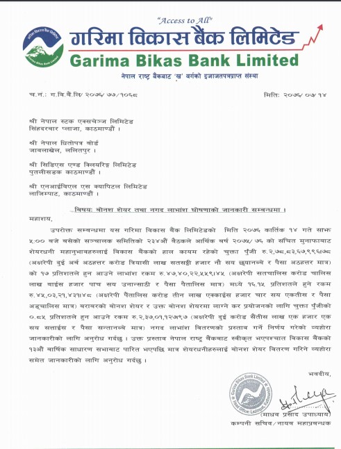काठमाडौं । गरिमा विकास बैंकले गत आर्थिक वर्षको संचित मुनाफाबाट शेयरधनीलाई लाभांश प्रस्ताव गरेका छ ।