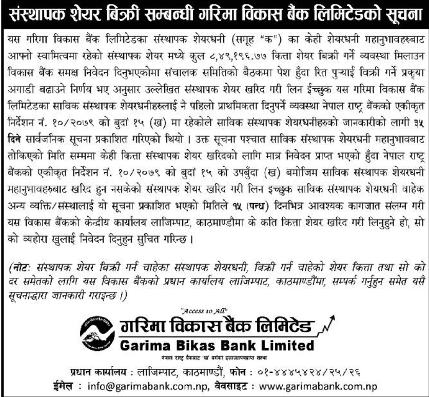 काठमाडौं । गरिमा विकास बैंक लिमिटेडले संस्थापक समूहतर्फको शेयर सर्वसाधारणले खरीद गर्न पाउने गरी विक्री खुला गरेको छ । बैंकका केही संस्थापक शेयरधनीहरूले आफ्नो नाममा रहेको ८ लाख ४९ हजार १९६ दशमलव ७७ कित्ता शेयर विक्रीका लागि निवेदन दिएबमोजिम कम्पनीले विक्री गर्न लागेको हो ।