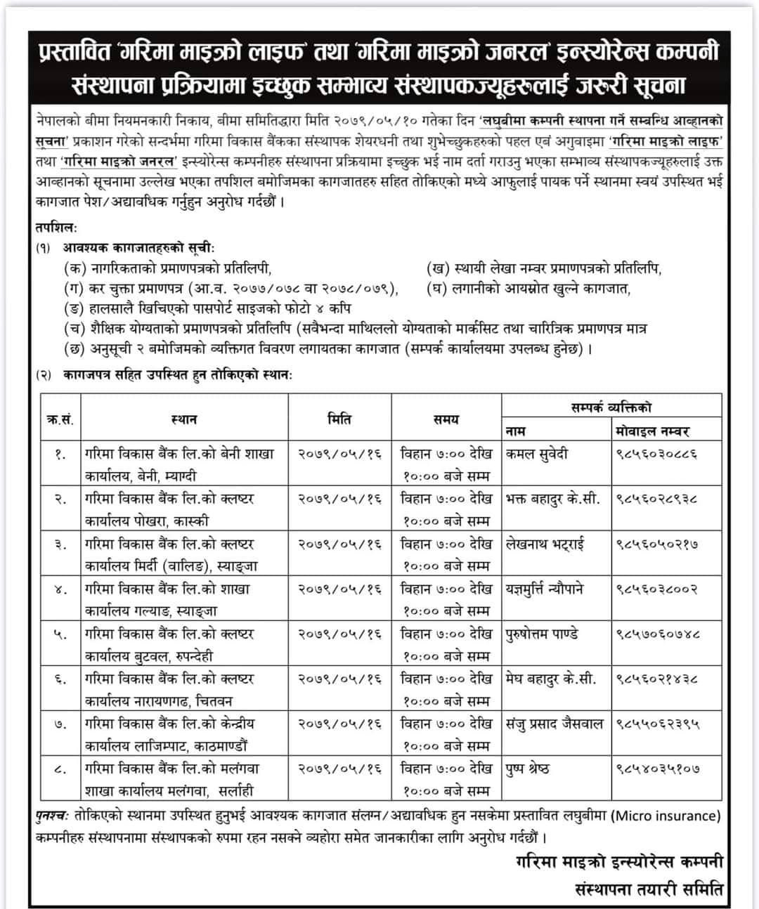 काठमाडौं । गरिमा विकास बैंकले माइक्रोइन्स्योरेन्स कम्पनी खोल्ने भएको छ । बैंकले प्रस्तावित ‘गरिमा माइक्रोइन्स्योरेन्स कम्पनी’ मा लगानी गर्न इन्छुकहरु सँग आवस्यक काजगपत्र सहित प्रस्ताव पेश गर्न आह्वान समेत गरेको छ ।