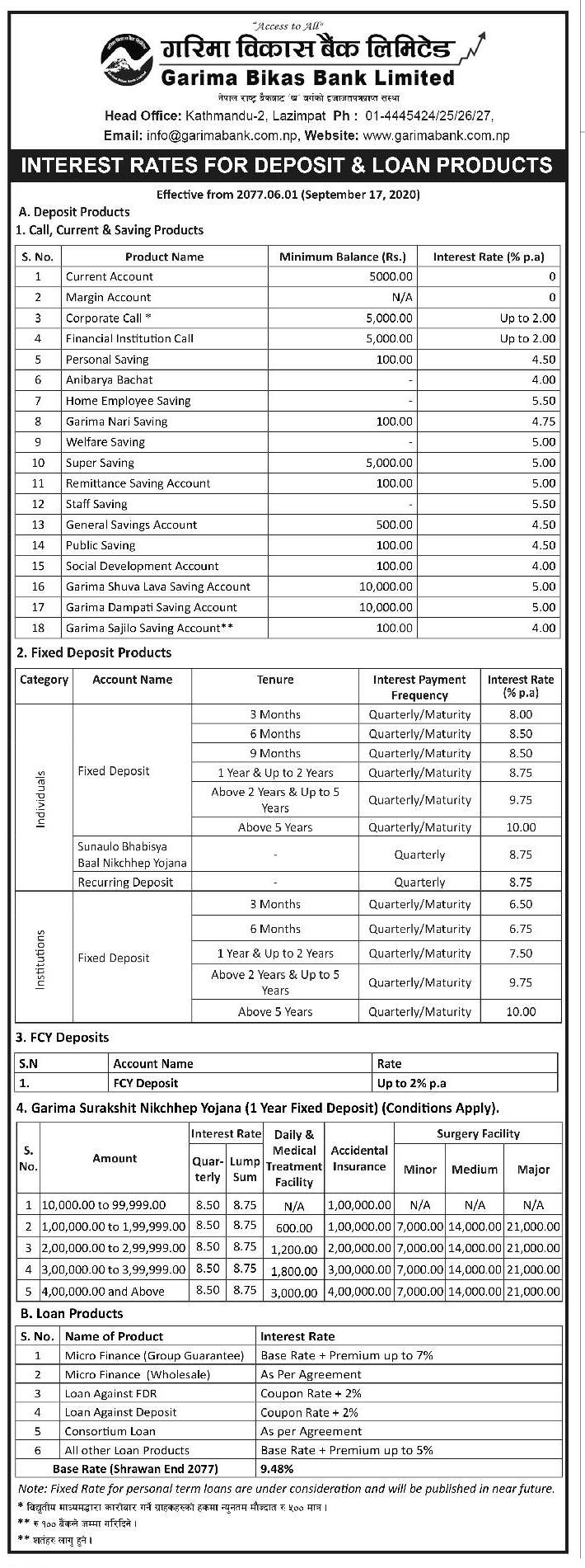 काठमाडौं । गरिमा विकास बैंक लिमिटेडले नयाँ व्याजदर प्रकाशन गरेको छ । बैंकले विभिन्न खातामा भोलि असोज १ गतेबाट लागू हुने गरी नयाँ व्याजदर सार्वजनिक गरेको हो ।