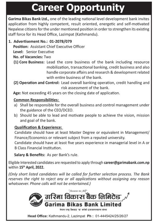 काठमाडौं । गरिमा विकास बैंकले कर्मचारी माग गरेको छ । कम्पनीले असिस्टेन्ट चिफ एक्जुकेटिभ अफिसर,सिनियर एक्जुकेटिभका लागि २ जना कर्मचारीको माग गरेको छ । ईच्छुक तथा योग्यता पुगेकाले अप्रिल १५ सम्म आवेदन दिनुपर्नेछ ।