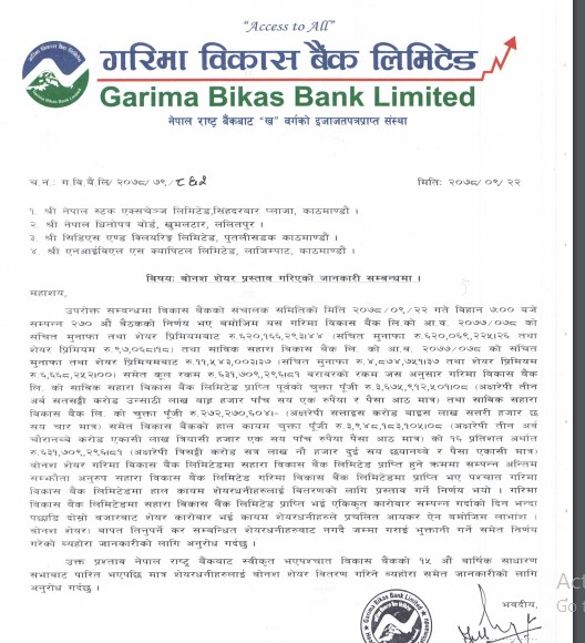 गरिमा विकास बैंकले घोषणा गर्यो लाभांश