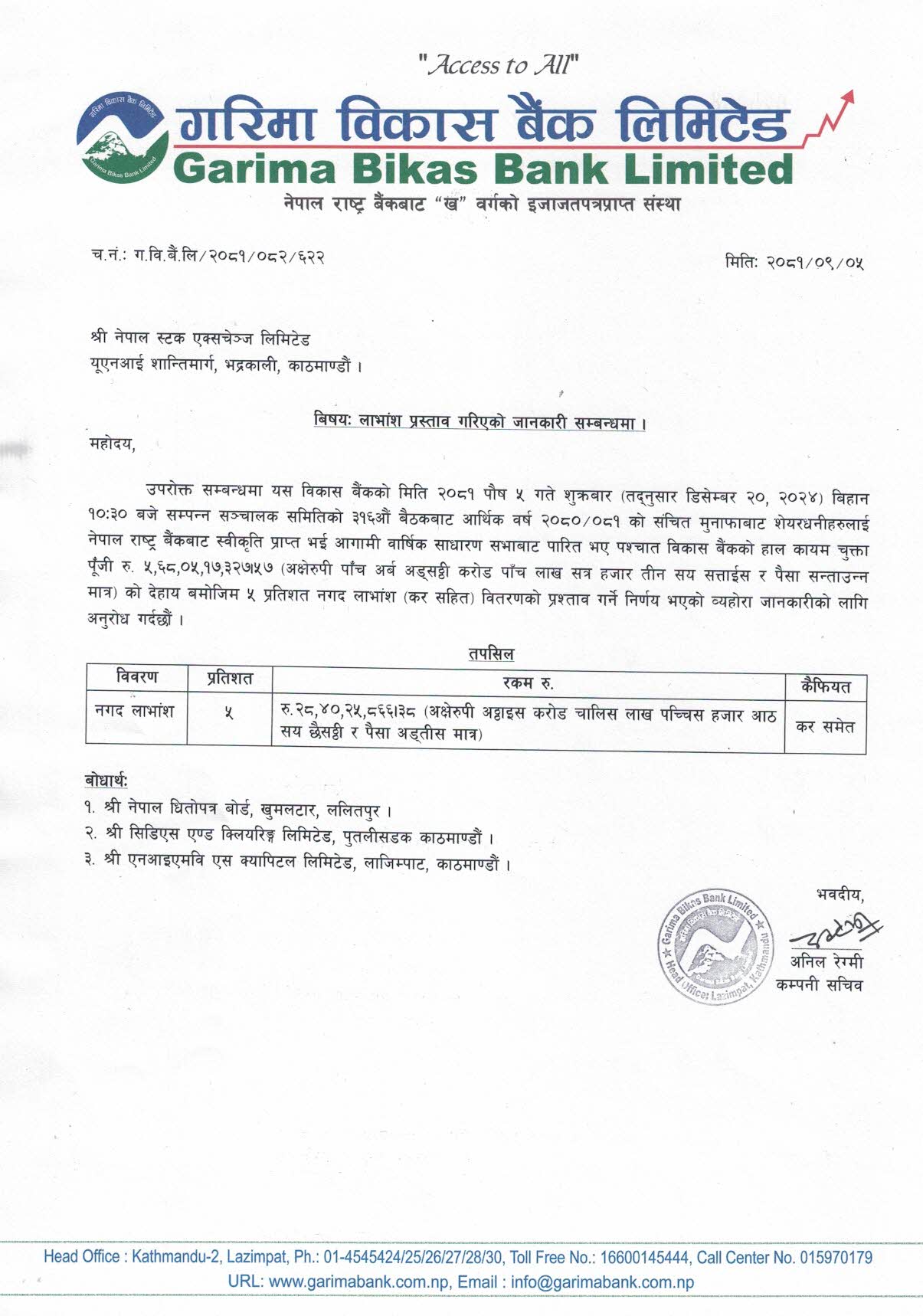काठमाडौं । गरिमा विकास बैंकले लाभांश घोषणा गरेको छ । बैंकको आज पुस ५ गते शुक्रबार बसेको कम्पनी सञ्चालक समितिको बैठकले गत आर्थिक वर्षको नाफाबाट शेयरधनीहरुलाई नगद मात्रै लाभांश दिने घोषणा गरेको हो।