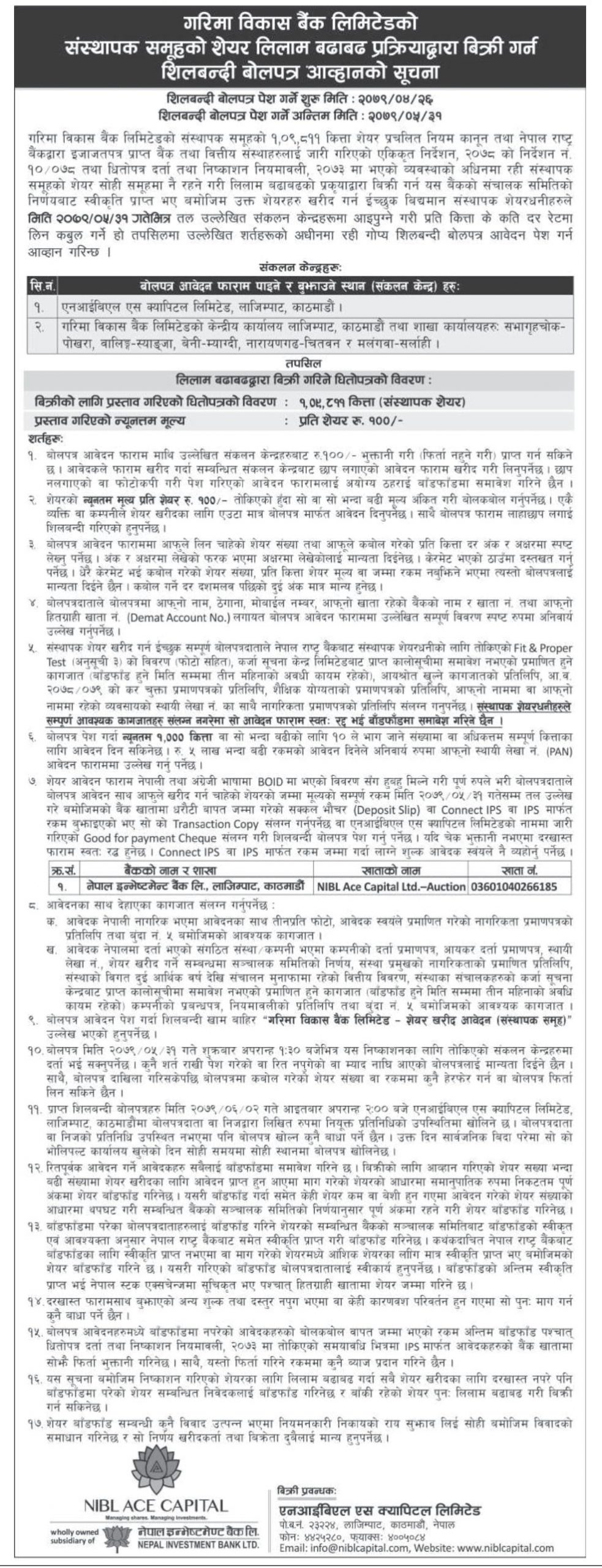 उक्त संस्थापक शेयरमा इच्छुक शेयरधनीले भदौ ३१ गतेसम्म विक्री प्रबन्धक एनआईबिएल एस क्यापिटल लिमिटेड लाजिम्पाट, काठमाडौं र गरिमा विकास बैंकका विभिन्न शाखा कार्यलयबाट बोलपत्र आवेदन फारम बुझाउनुपर्नेछ ।