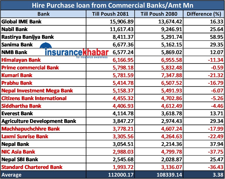 अघिल्लो वर्षको तुलनामा समीक्षा अवधिमा ११ वटा बैंकको गाडी कर्जा घटेको छ भने बाँकी ९ वटा बढेको छ। सर्वाधिक गाडी कर्जा प्रवाह गर्नेमा ग्लोबल आइएमई अग्रस्थानमा रहेको छ भने वृद्धिदरका हिसाबले राष्ट्रिय वाणिज्य बैंक अगाडि रहेको छ।