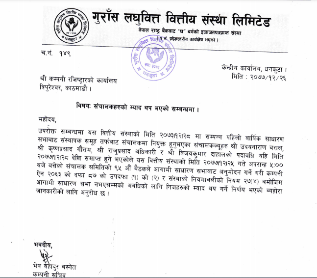 काठमाडौं । गुँरास लघुवित्त वित्तीय संस्था लिमिटेडमा चार जना सञ्चालकहरुको म्याद थप भएको छ । संस्थाको बुधवार बसेको सञ्चालक समितिको बैठकले उक्त निर्णय गरेको हो ।