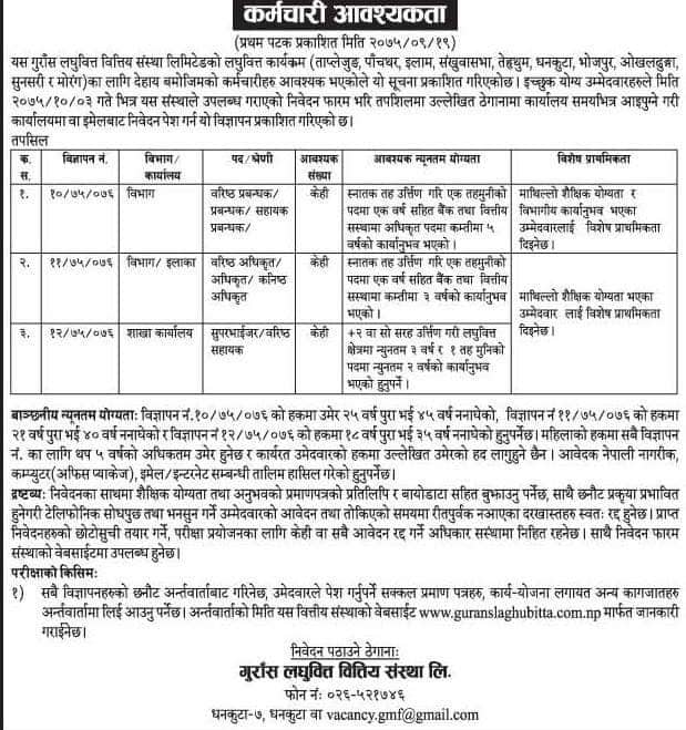 गुँरास लघुवित्त वित्तिय संस्था लिमिटेडले विभिन्न पदका लागि कर्मचारी माग गरेको छ । लघुवित्तले कार्यालय विभागका लागि वरिष्ठ प्रबन्धक, सहायक प्रबन्धक र सुपरभाईजर वरिष्ठ सहायक पदका लागि केही संख्यामा कर्मचारीहरुको माग गरेको हो ।