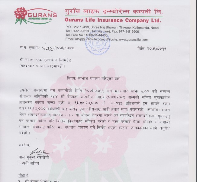 गुँरास लाइफको लाभांश घोषणा