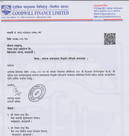 काठमाडौं । गुडविल फाइनान्स लिमिटेडले स्वतन्त्र सञ्चालकमा प्रा.डा. सुशिल भक्त माथेमा नियुक्त भएका छन् । कम्पनीको आइतवार बसेको सञ्चालक समितिको बैठकले स्वतन्त्र सञ्चालकमा माथेमालाई नियुक्त गरेको कम्पनीले जनाएको छ ।