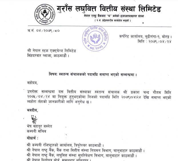 काठमाडौं । गुराँस लघुवित्त वित्तीय संस्थाका स्वतन्त्र सञ्चालक प्रकाशचन्द्र गौतमको पदावधि समाप्त भएको छ । गौतम कम्पनीको स्वतन्त्र सञ्चालकमा २०७५ साउन २४ गते नियुक्त भएकोमा निजको पदावधि २०७९ साउन २४ गते समाप्त भएको कम्पनीले जनाएको छ ।