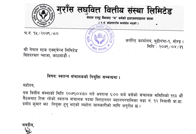 काठमाडौं । गुराँस लघुवित्त वित्तीय संस्थाको स्वतन्त्र सञ्चालकमा प्रा.डा. प्रमोदकुमार झा नियुक्त भएका छन् । कम्पनीको गत सोमवार बसेको सञ्चालक समितिको बैठकले रिक्त रहेको स्वतन्त्र सञ्चालक पदमा झालाई नियुक्त गरेको हो ।