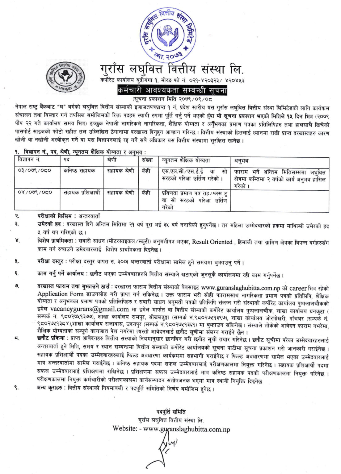 काठमाडौं । गुराँस लघुवित्त वित्तीय संस्था लिमिटेडले कर्मचारी माग गरेको छ । कम्पनीले कनिष्ठ सहायक, सहायक प्रशिक्षार्थीमा केही संख्यामा कर्मचारी मागेको हो । जसका लागि शैक्षिक योग्यता एसईई उत्तिर्ण गरेको हुनुपर्ने जनाएको छ ।
