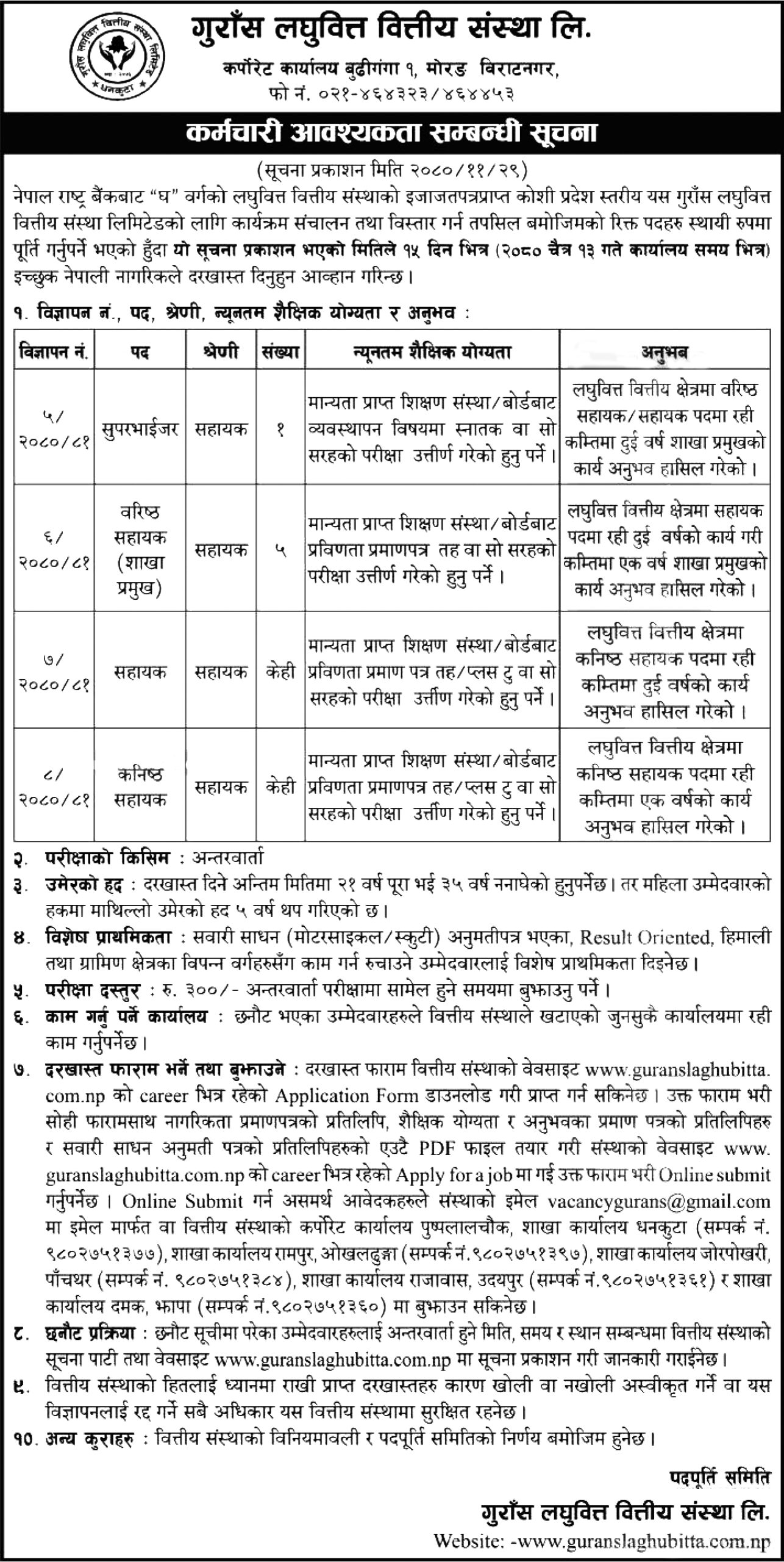 काठमाडौं । गुराँस लघुवित्त वित्तीय संस्था लिमिटेडले विभिन्न पदहरुका लागि कर्मचारी मगा गरेको छ । लघुवित्तले सुपरभाइजर पदका लागि १ जना, वरिष्ठ सहायक शाखा प्रमुखकका लागि ५ जना, सहायकका लागि केही र कनिष्ठ सहायकका लागि केही संख्यामा कर्मचारी माग गरेको हो ।