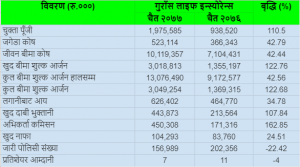 त्यस्तै हालसम्म कम्पनीले १३ अर्ब ७ करोड रुपैयाँ बीमा शुल्क आर्जन गरेको छ । यस वर्ष कुल बीमा शुल्क आर्जन पनि तीन अर्ब चार करोड रुपैयाँ छ । कम्पनीले यस वर्ष बीमा शुल्क आर्जनमा छलाङ मारेको छ । तर बीमा पोलिसी संख्या भने २२ प्रतिशतले घटेको देखिन्छ । गत वर्षको यहि अवधिमा २ लाख २ हजार ३५६ वटा बीमा पोलिसी बिक्री गरेकोमा यस वर्ष एक लाख ५६ हजार ९८९ वटा पोलिसी बिक्री गरेको छ ।