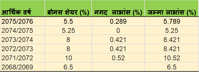सो लाभांश बीमा समितिले स्वीकृति गरेको जनाएको छ । उक्त लाभांश अब कम्पनीको आगामी साधारणसभाले पारित गरेपछि लगानीकर्ताहरुले प्राप्त गर्न सक्नेछन् ।