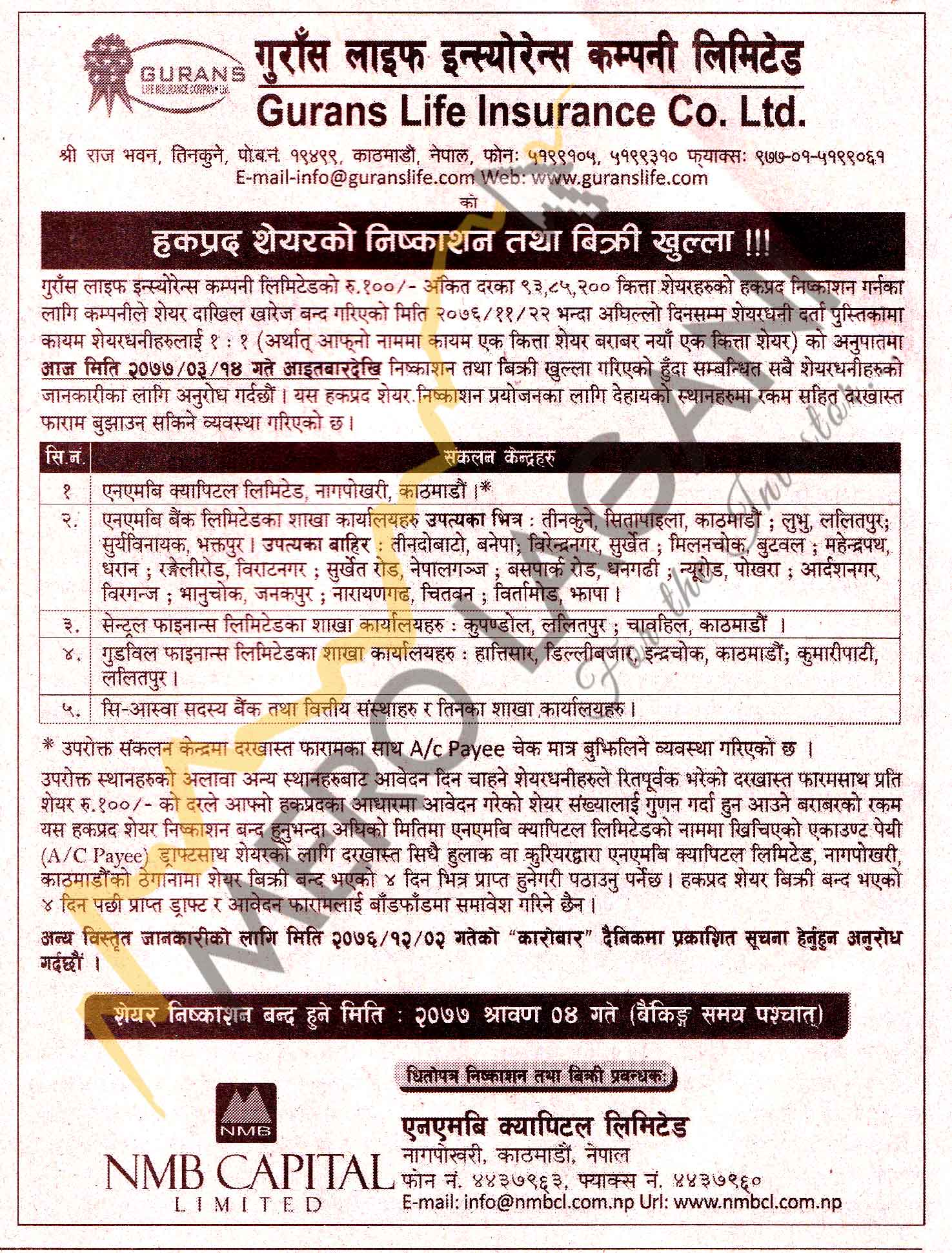 काठमाडौं । गुराँस लाइफ इन्स्योरेन्स कम्पनी लिमिटेडले आज असार १४ गतेदेखि शतप्रतिशत हकप्रद शेयर निष्काशन तथा बिक्री खुला गरेको छ। कम्पनीले यस अघि गत चैत २० गतेदेखि हकप्रद निष्काशन गर्ने भनेको थियो। कोरोना महामारीका कारण चैत ११ गतेदेखि नै लकडाउन गरिएकाले कम्पनीको उक्त हकप्रद निष्काशन प्रक्रिया स्थिगित गरेको थियो।