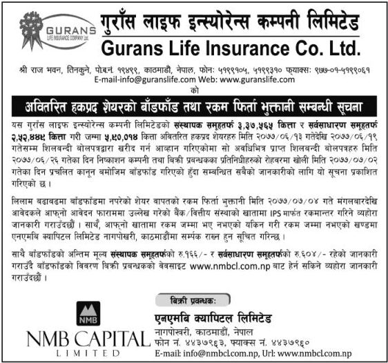 काठमाडौं । गुराँस लाइफ इन्स्योरेन्स कम्पनी लिमिटेडले असोज १३ गते, मंगलबारदेखि असोज १९ गते, सोमबारसम्म लिलामी मार्फत बिक्री गरेको अवितरित हकप्रद शेयर बाँडफाँड गरिएको छ ।