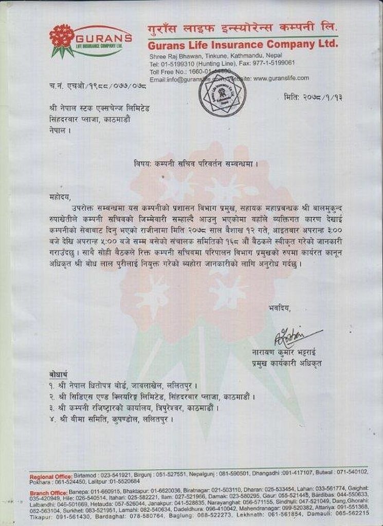 साथै, सोही बैठकले यो भन्दा अगाडीका कम्पनी सचिव बालमुकुन्द रुपाखेतीले दिएको राजिनामा पनि स्वीकृत गरेको छ ।