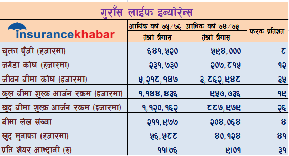 गुराँस लाईफ इन्स्योरेन्सले आर्थिक वर्ष ७५/७६ को तेश्रो त्रैमासको वित्तिय विवरण सार्वजनिक गरेको छ। इन्स्योरेन्सको कुल बीमा शुल्क आर्जन रकम १९ प्रतिशतले वृद्धि भएको छ। कम्पनीले यस आर्थिक वर्षको तेश्रो त्रैमास सम्म १ अर्ब १४ करोड कुल बीमा शुल्क आर्जन गरेको छ।