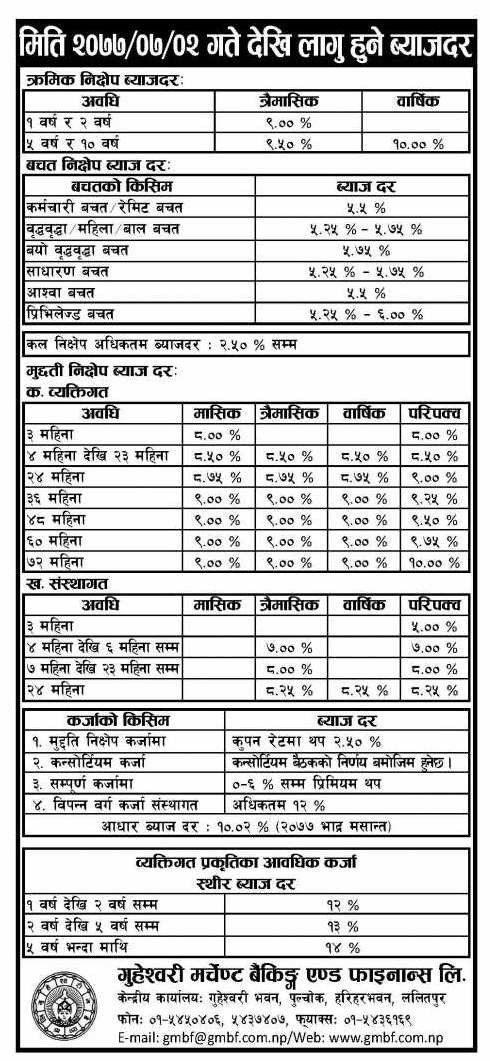 काठमाडौं । गुहेश्वरी मर्चेन्ट बैंकिङ्ग एण्ड फाइनान्स लिमिटेडले नयाँ व्याजदर सार्वजनिक गरेको छ । फाइनान्सले विभिन्न खातामा आजबाट लागू हुने गरी नयाँ व्याजदर सार्वजनिक गरेको हो ।