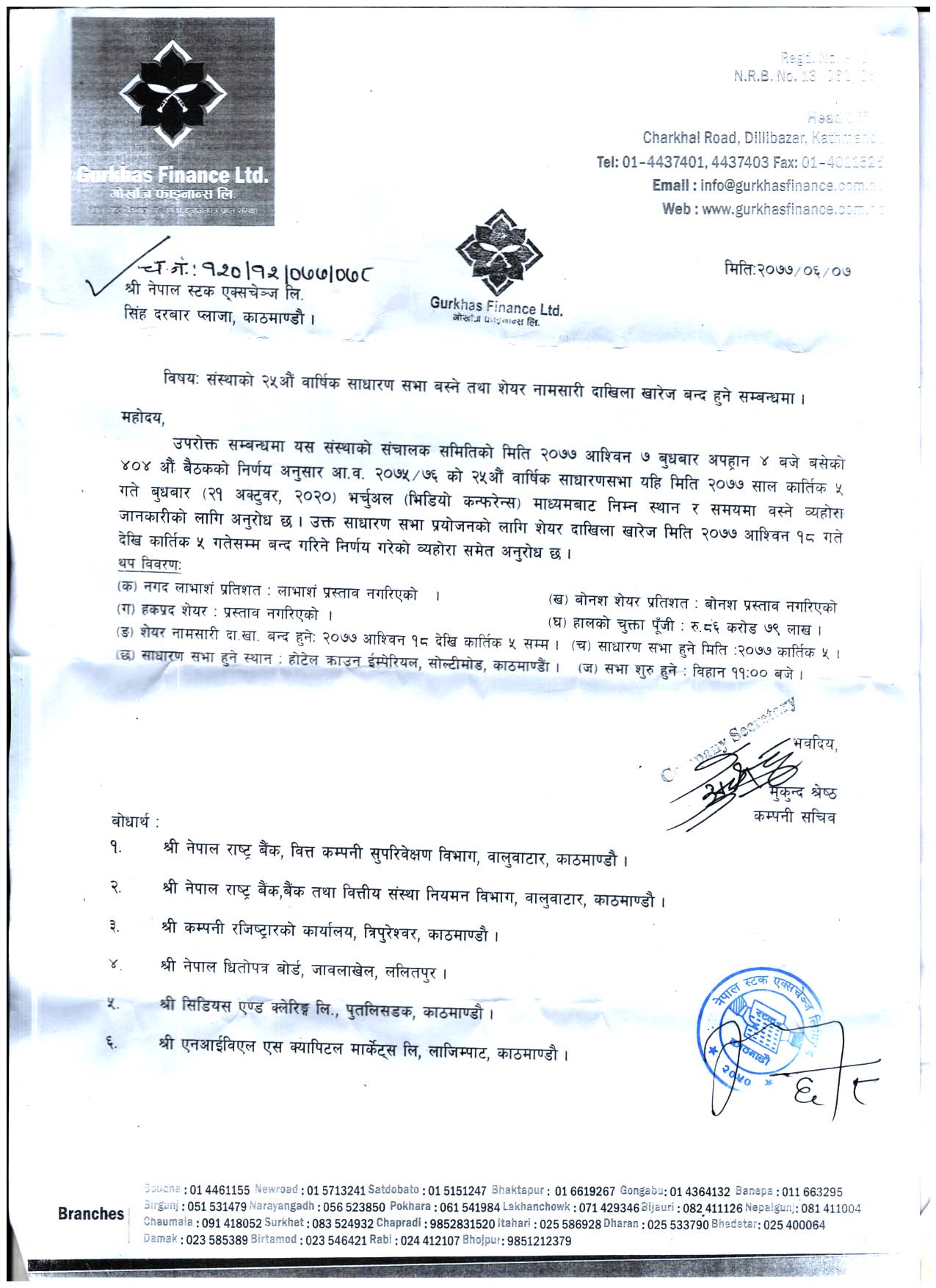 गोर्खाज फाइनान्सको साधारण सभा कार्तिक ५ गते, बुक क्लोज कहिले ?