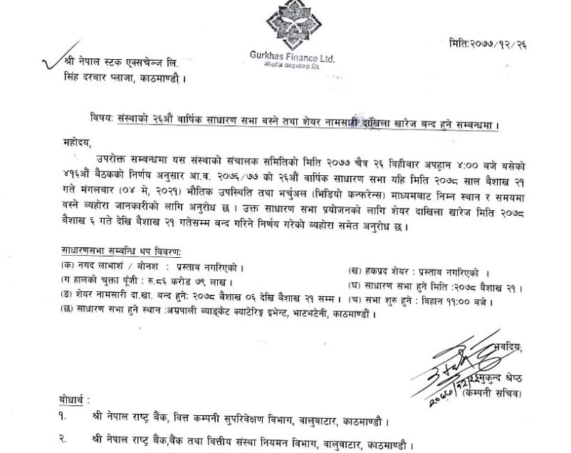 काठमाडौं । गोर्खाज फाइनान्स लिमिटेडको २६औं वार्षिक साधारण सभा बैशाख २१ गते गर्ने भएको छ । कम्पनीको बिहीवार बसेको सञ्चालक समितिको बैठकले साधारण सभा गर्ने निर्णय गरेको हो । कम्पनीले सभा आम्रपाली ब्याक्वेंट इभेन्ट भाटभटेनीमा बिहान ११ बजे गर्ने जनाएको छ ।